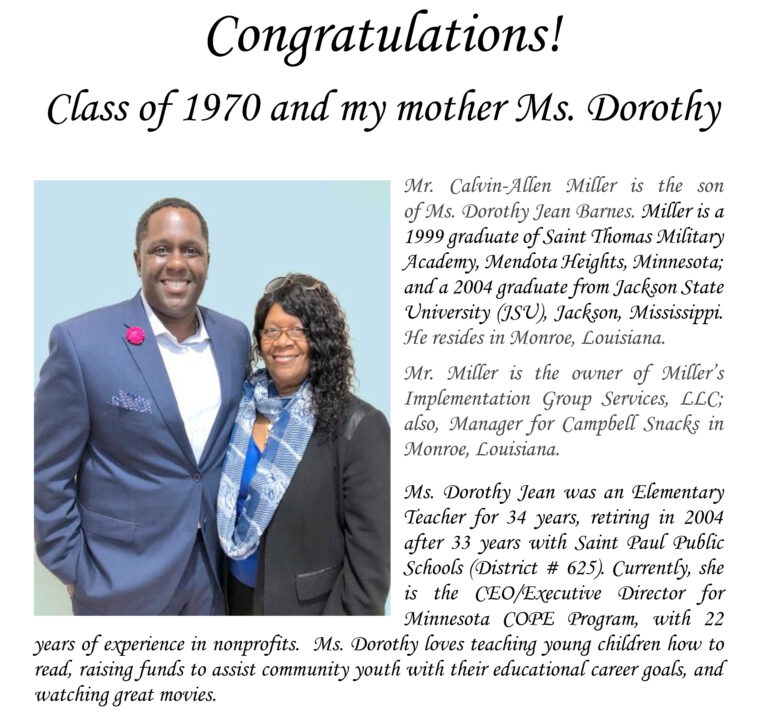 It is our honor and pleasure to announce and thank all the donors who assisted Minnesota COPE Program with raising $1,000.00 for Jackson State University (JSU), Department of English and Modern Languages. The following individuals contributed to Ms. Dorothy’s 50th Golden Diploma Celebration from JSU; they reside in Jackson, Mississippi and the surrounding areas. Also, donors from Little Rock, Arkansas, Riverdale, Georgia, Wake Forest, North Carolina, Greenville, South Carolina, Hollis Hills, New York, Fredericksburg, Texas and Rowlett, Texas